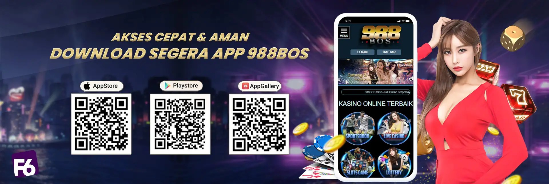 988BOS hadir sebagai salah satu agen judi online yang menyediakan berbagai jenis permainan – permainan seperti permainan judi casino online, slot game online, sabung ayam online, judi bola online, poker online, togel online dan berbagai jenis permainan kartu lainnya, anda dapat langsung bergabung dan memilih permainan yang anda gemar di 988BOS, dengan minimal deposit yang sangat terjangkau maka anda bisa memiliki kesempatan untuk memenangkan banyak uang.
